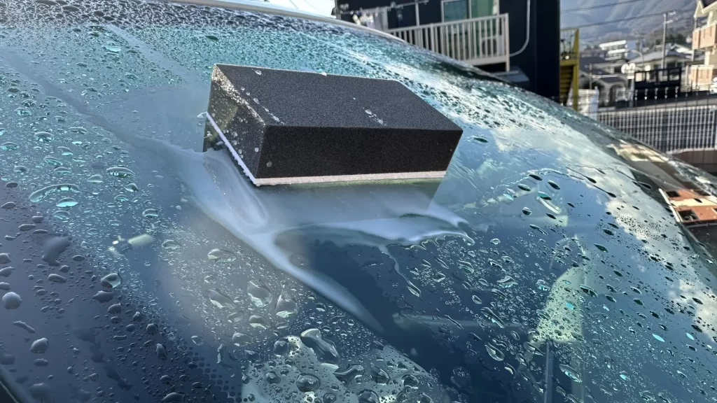 その部分はもう一度油膜取りで擦ってください - 撥水コーティング剤の容器を潰し、付属のフェルト(スポンジ)に液を染込ませる