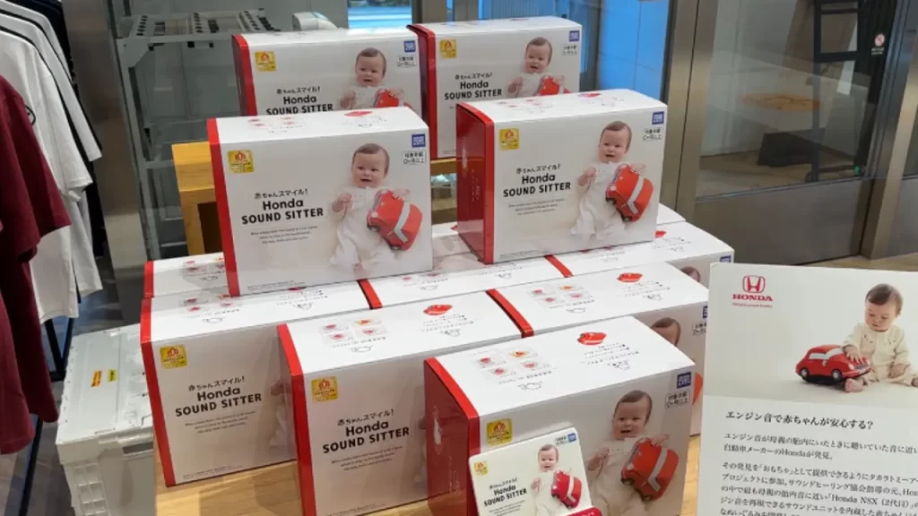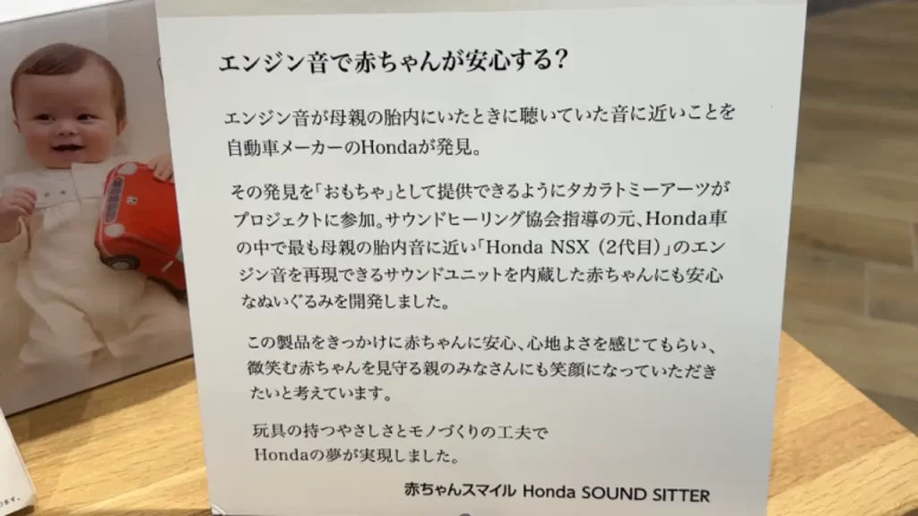 なぜ赤ちゃん向けの商品なのかというと、ホンダのNSXのエンジン音が胎内音の周波数特性と似ていて、赤ちゃんにとって心地の良い音が出るからだそうです。
