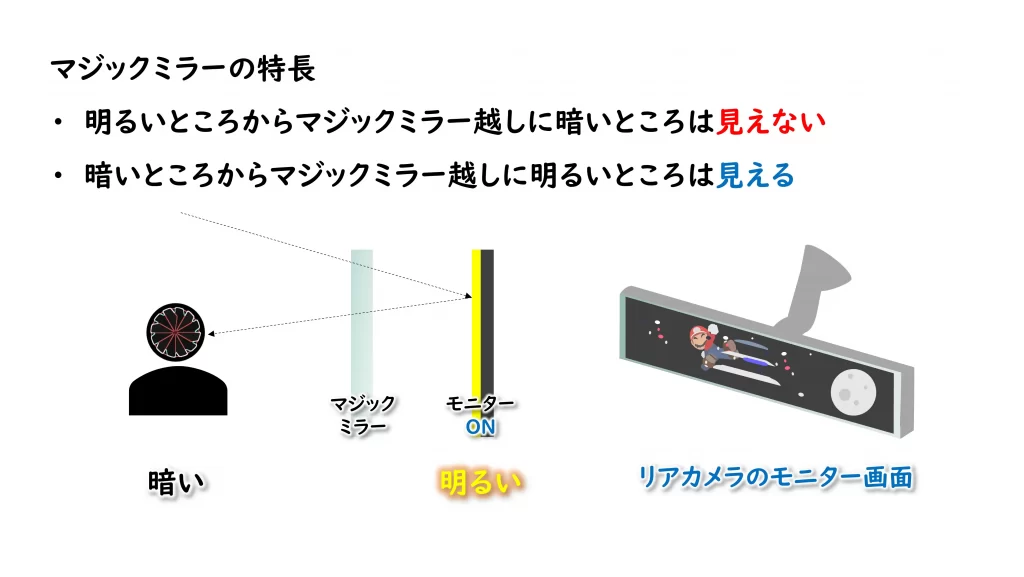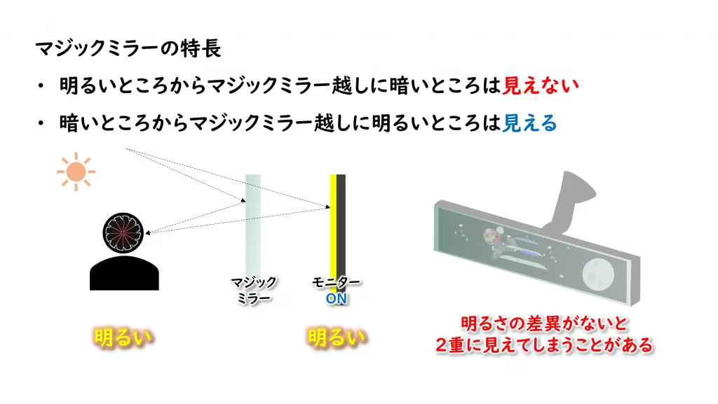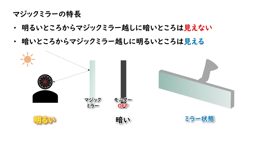 このハーフミラーは、言い換えると、マジックミラーのことで、周囲の光の大きさによって、ミラーになったり、透明になったりします。